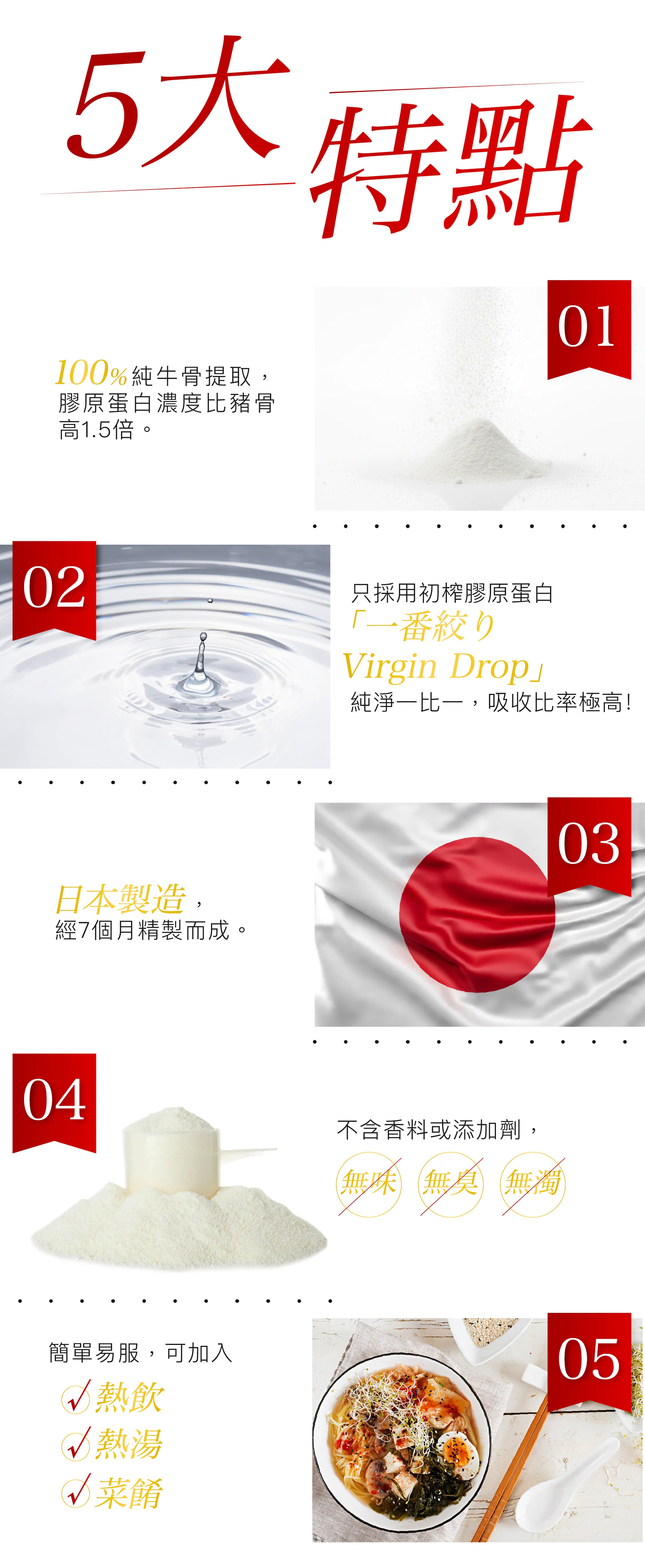 「日本最強」原料取自牛骨,膠原蛋白bloom 300,濃度是豬骨的1.5倍。Virgin Drops 無味無臭,不添加任何調味料或甜味劑。
